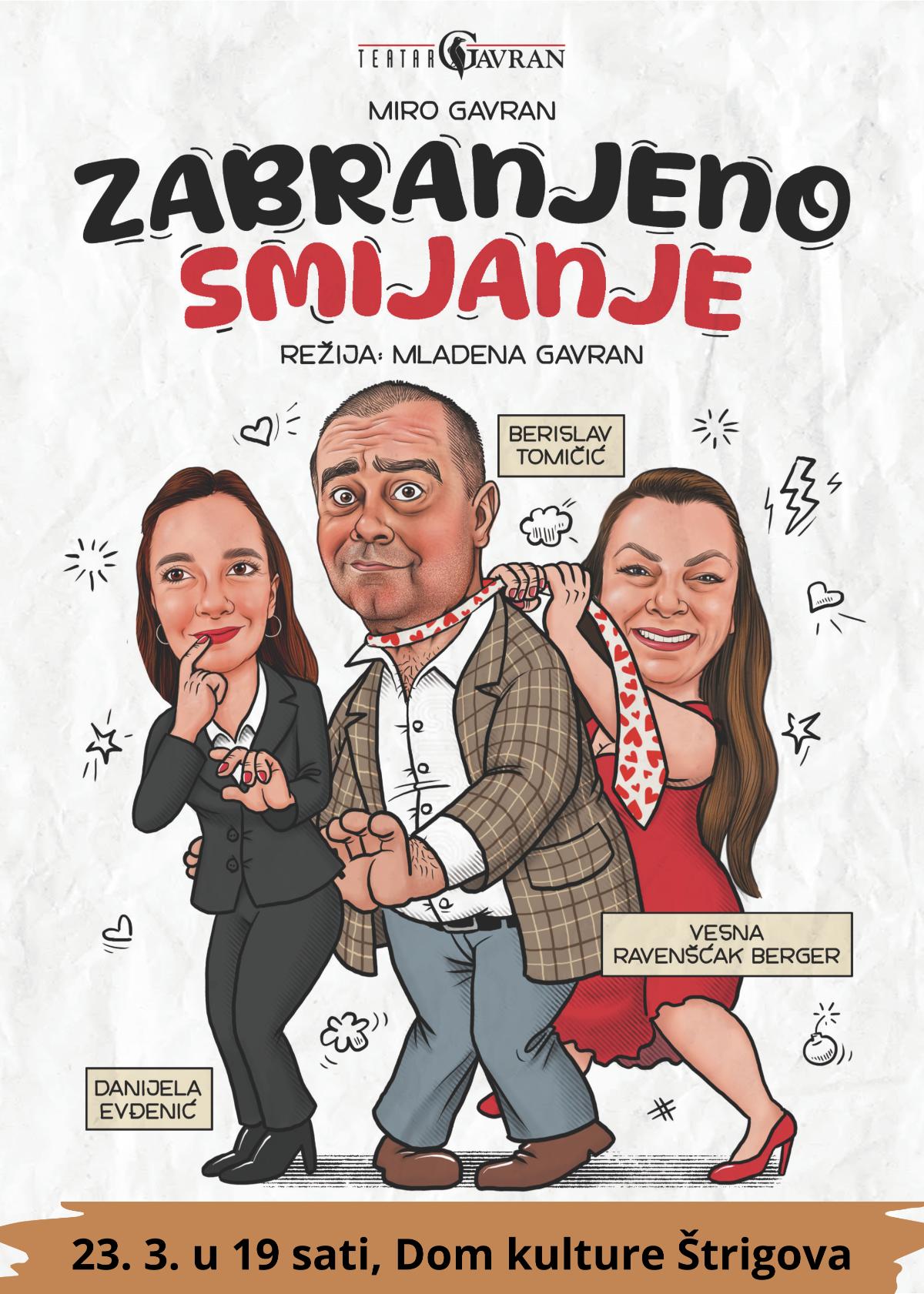U nedjelju, 23. ožujka u 19 sati, na scenu Doma kulture Štrigova stiže Teatar GAVRAN s predstavom Zabranjeno smijanje, komedijom iz pera jednog od najuspješnijih i najnagrađivanijih hrvatskih pisaca i dramatičara, Mire Gavrana.
