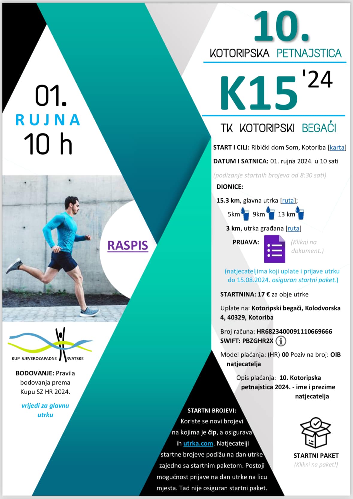 Startnina za obje utrke iznosi 17 eura, a sportsku majicu Joma kratkih rukava, mesni ili vegetarijanski obrok, sok, startni broj s čipom i čokoladicu. Generalni pokrovitelj utrke je Općina Kotoriba, a pokrovitelji su i Zajednica sportskih udruga i saveza Međimurske županije, OPG Siladi, Carlsberg Croatia i Pizzeria Majo.