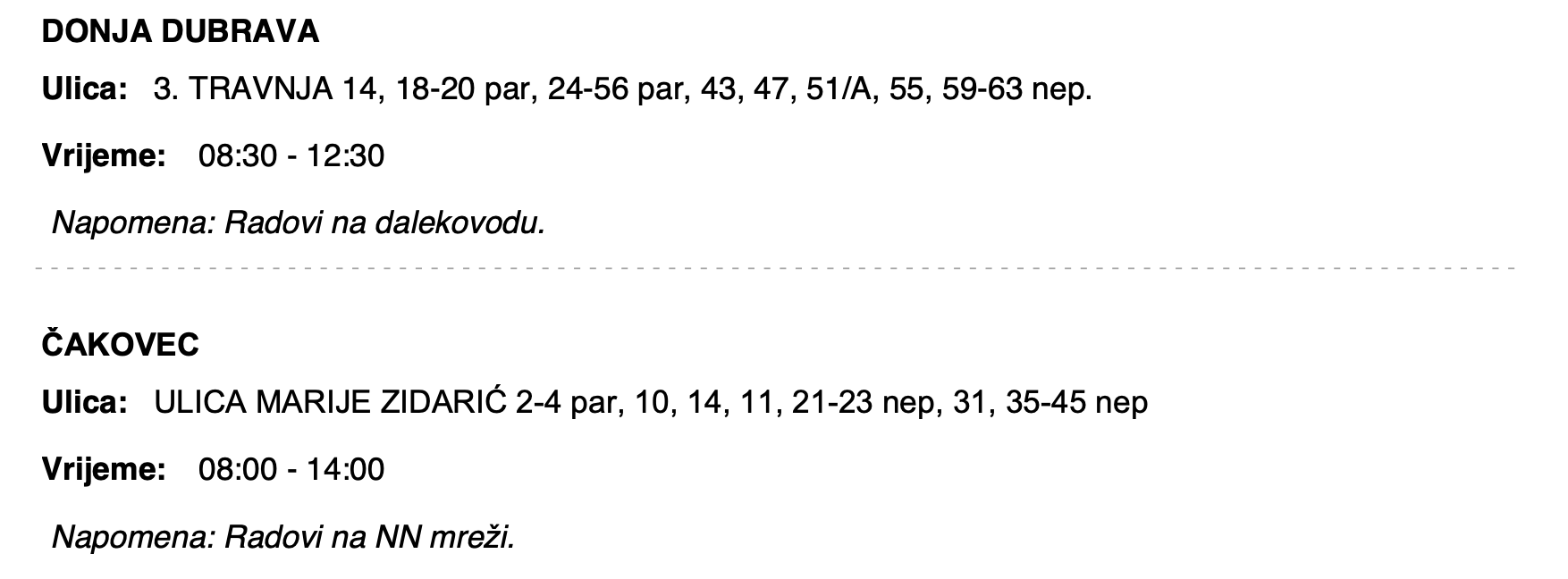 U petak Donja Dubrava i Čakovec bez struje