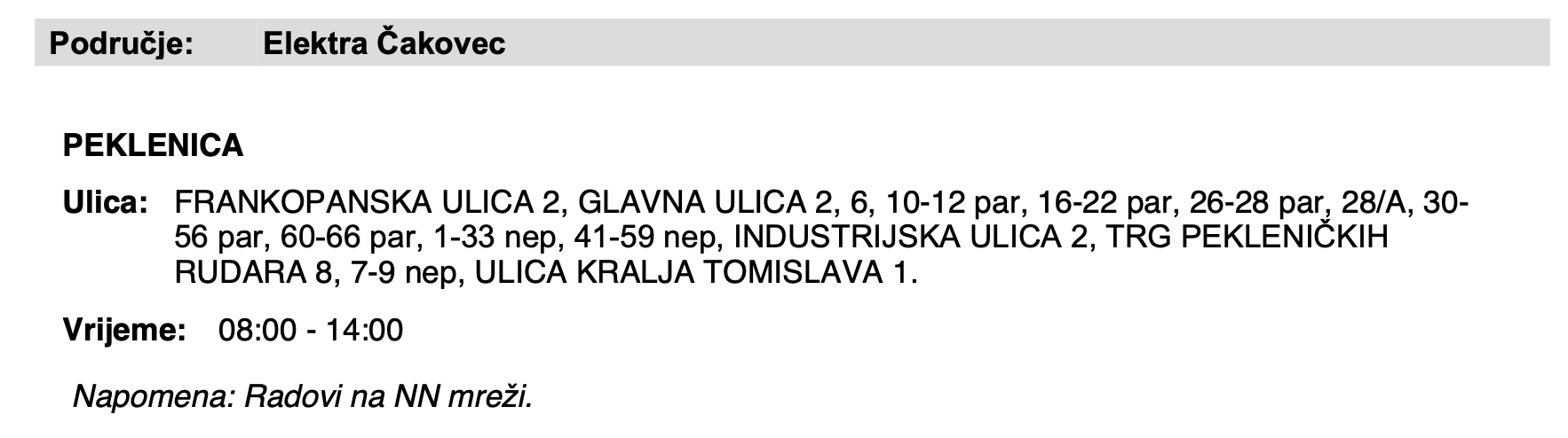 Iz HEP-a javljaju kako u ponedjeljak, 7. travnja bez struje ostaje Peklenica.
