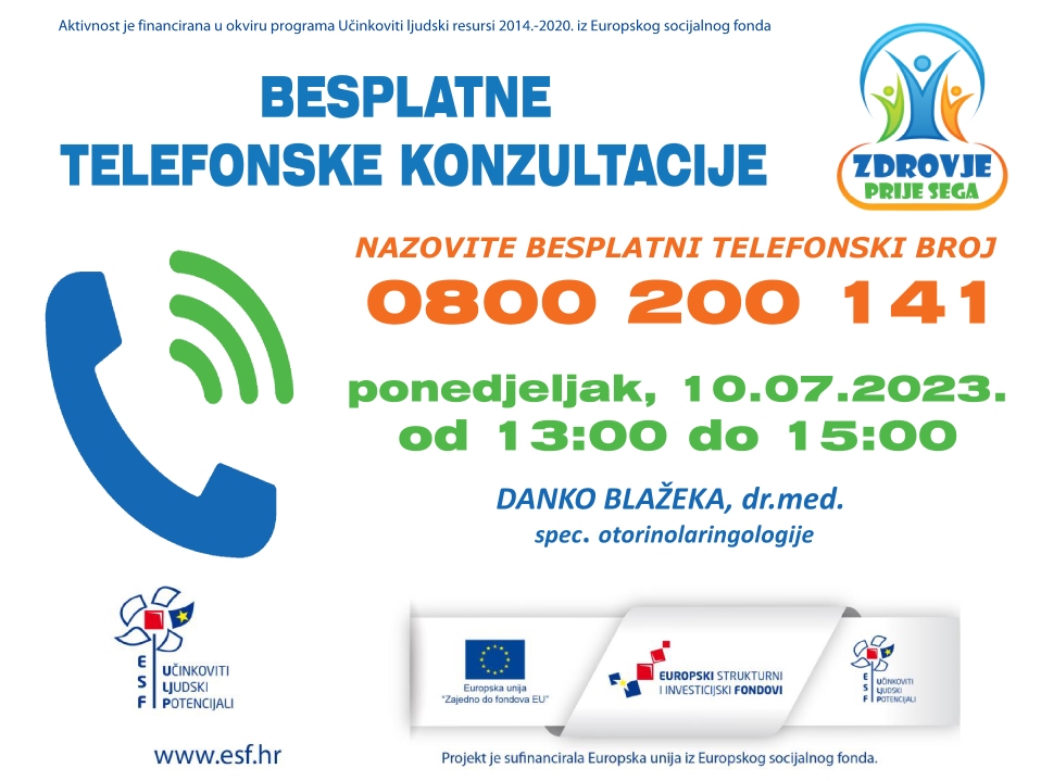 U sklopu projekta „Zdrovje prije sega“ Općina Nedelišće organizira svaki mjesec besplatne telefonske konzultacije s liječnikom specijalistom. U ponedjeljak 10.07.2023. godine od 13:00 do 15:00 sati konzultacije će pružati Danko Blažeka, dr.med. spec. otorinolarinologije.