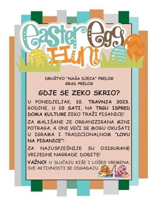 U organizaciji Društva Naša djeca Prelog, u ponedjeljak, 10. travnja 2023. godine održat će se “Lov na pisanice”. Sve počinje od 10 sati, na Trgu Slobode, ispred Doma kulture, gdje će zeko tražiti pisanice.