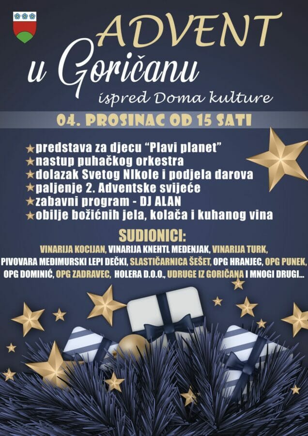 Ako se u subotu, 4. prosinca 2021. godine poslijepodne, nađete u centru naselja Goričan, doživjet ćete pravu božićnu čaroliju – „Advent u Goričanu“, ugodno mjesto za druženje uz tisuće lampica i predivnih dekoracija, opojne mirise kuhanog vina i punča, fritule, kolače i još mnogo toga!