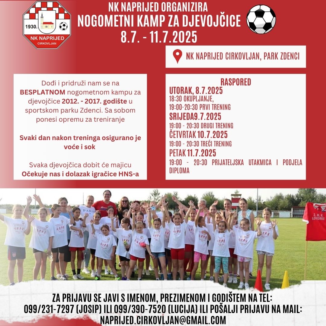 Nakon uspješnog 1. Nogometnog kampa za djevojčice prošle godine, Nogometni klub Naprijed Cirkovljan i ŽNK Lovorke Cirkovljan od 8. do 11. srpnja 2025. godine u Parku Zdenci (Ulica Udenci 33) u Cirkovljanu organiziraju i 2. Nogometni kamp za djevojčice!