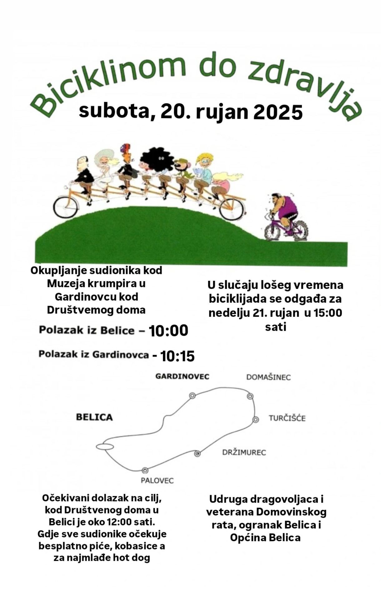U slučaju lošeg vremena, biciklijada se odgađa za nedjelju, 21. rujna u 15 sati.
