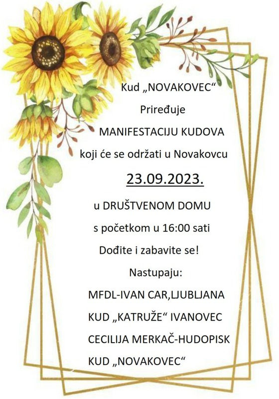 U subotu, 23. rujna 2023. godine u Društvenom domu u Novakovcu (općina Podturen), u organizaciji KUD-a Novakovec, održat će se kulturna manifestacija i druženje prijateljskih KUD-ova.