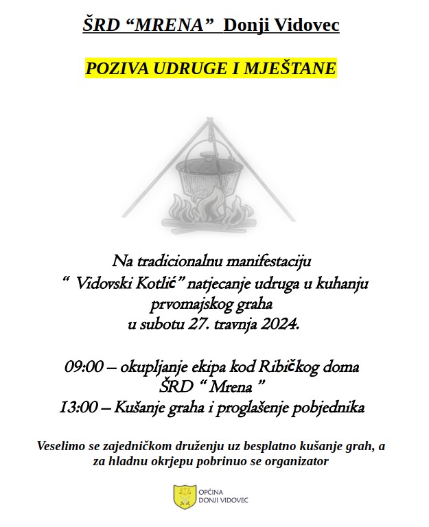 Povodom Praznika rada, 1. maja, Općina Donji Vidovec i SRD „Mrena“ pozivaju vas na tradicionalni „Vidovski kotlić“ kod Ribičkog doma u subotu, 27. travnja 2024. godine.