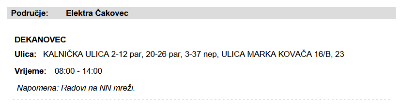 Zbog planiranih radova na elektroenergetskoj mreži, u utorak 8. srpnja doći će do prekida u isporuci električne energije na području naselja Dekanovec.