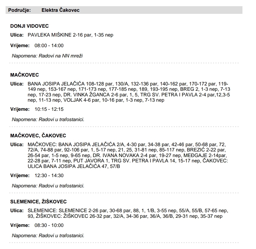 U utorak će bez struje biti Donji Vidovec, Mačkovec, Čakovec, Slemenice i Žiškovec