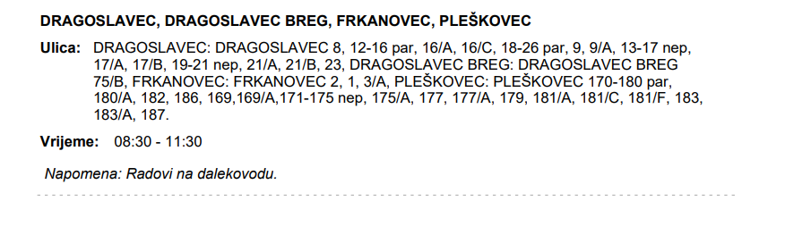 Iz HEP-a smo zaprimili informaciju da zbog radova na dalekovodu, u utorak, 18. srpnja, struje neće biti u sljedećim mjestima: