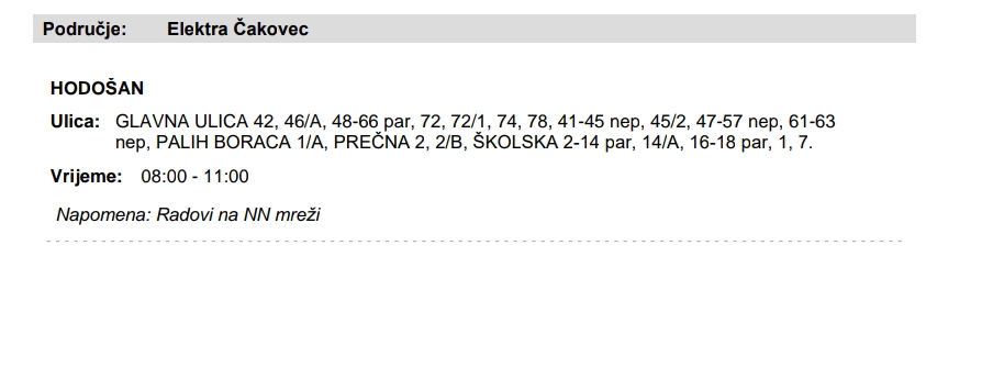 Iz čakovečkog HEP-a stigla je informacija kako u utorak, 18. veljače, neće biti struje u Hodošanu, a evo i detalja: