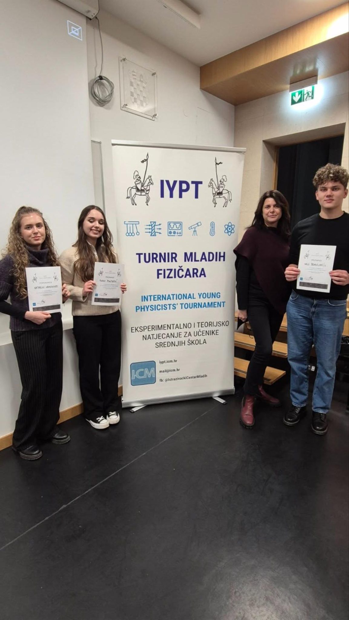 U ovom vrlo zahtjevnom konceptu natjecanja, šest ukupno najbolje ocijenjenih natjecatelja čini ekipu koja će sudjelovati na međunarodnom natjecanju IYPT 2025 (International Young Physicists’ Tournament) u srpnju u Švedskoj. Naša trojka pokazala je da se itekako može nositi s izazovima iz svijeta fizike: Ivana i Val izborili su svoje mjesto u šesteročlanom timu, dok je Katarini plasman izmaknuo za stotinku boda.