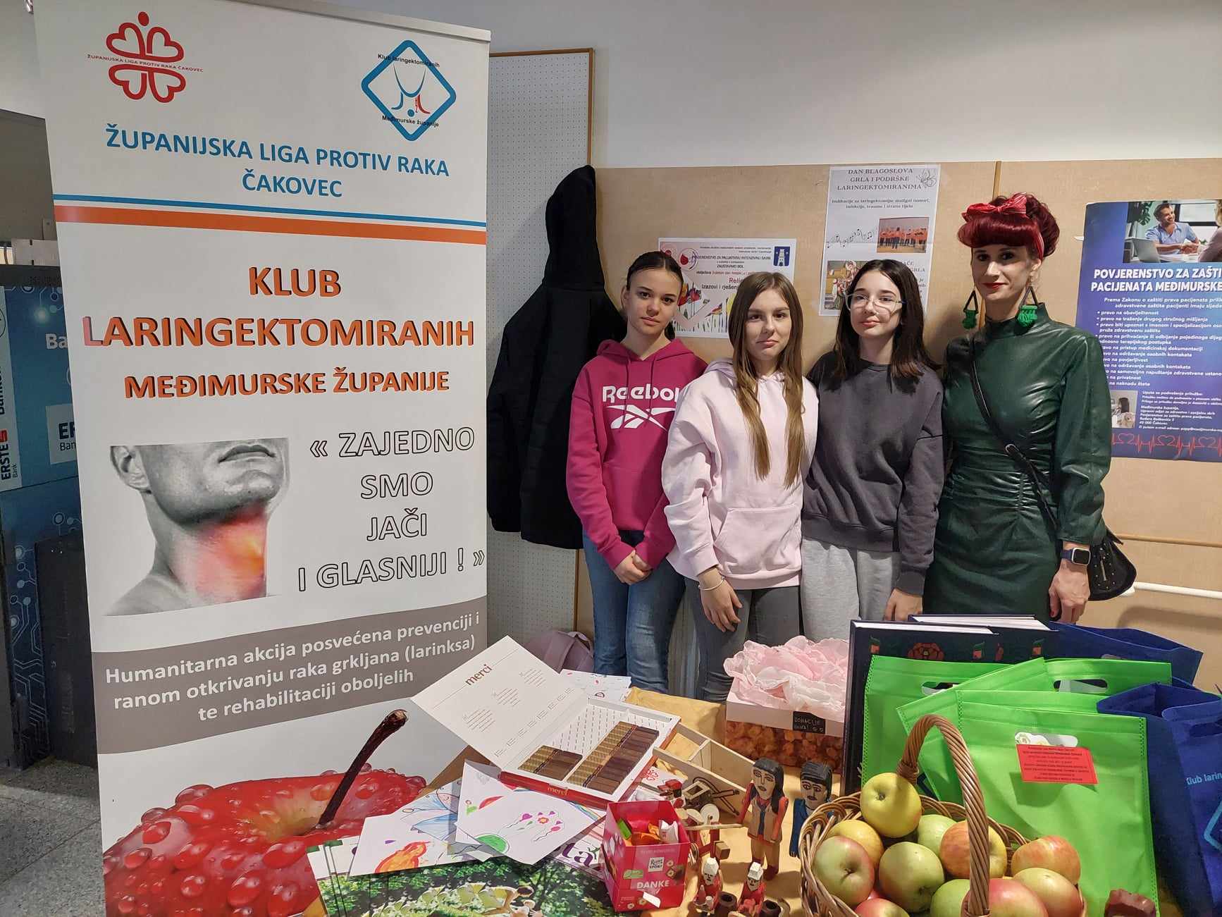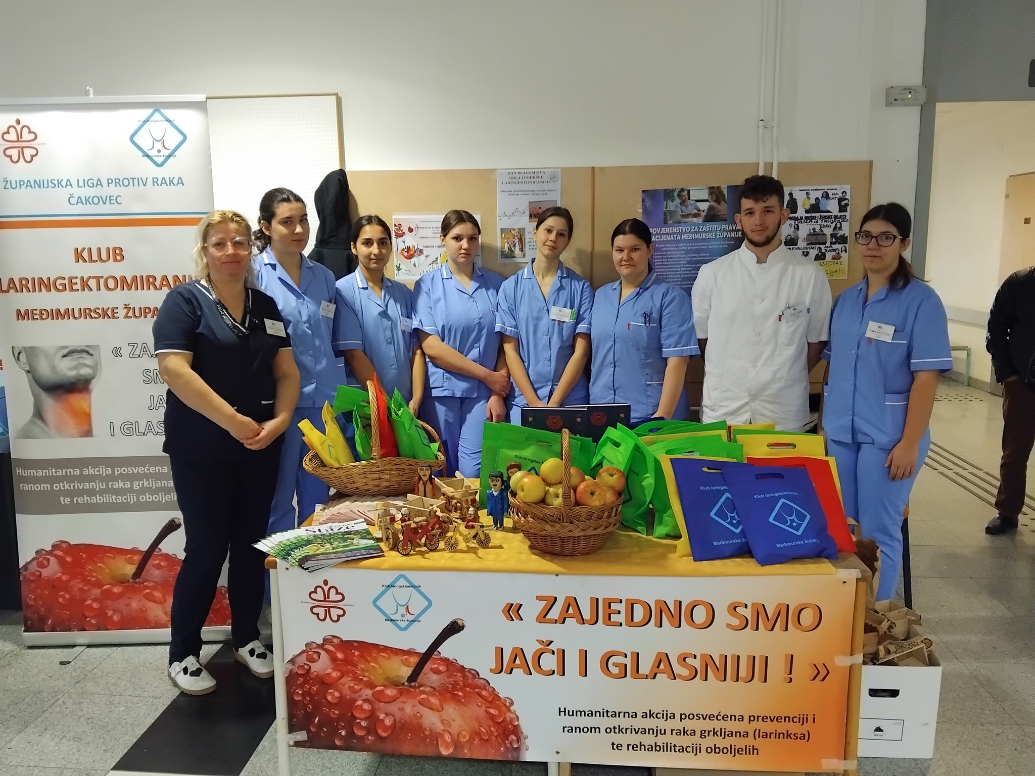 Posjetitelji su u bolničkom holu mogli dobiti važne informacije vezane uz liječenje i prevenciju raka grla, kao i informacije vezane uz aktivnosti Kluba laringektomiranih. Kao i svaki puta učenici 4.c i 5.c razreda Srednje škole Čakovec pridružili su se obilježavanju ove akcije uz potporu nastavnica Brigite Prstec (na slici s učenicima) i Đurđice Hlapčić.
