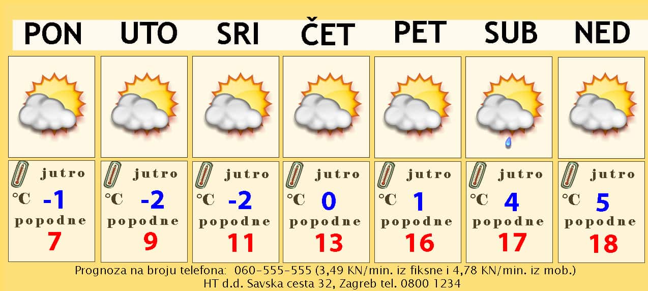 Mraza će vrlo vjerojatno biti i u srijedu ujutro. Danju suho, djelomično sunčano i napokon bez ikakvog većeg vjetra. To će odmah značiti i bolji osjećaj ugodnosti. Nakon jutarnjih -2°C popodnevna temperatura bi mogla narasti do 11 ili 12 Celzijevih stupnjeva.