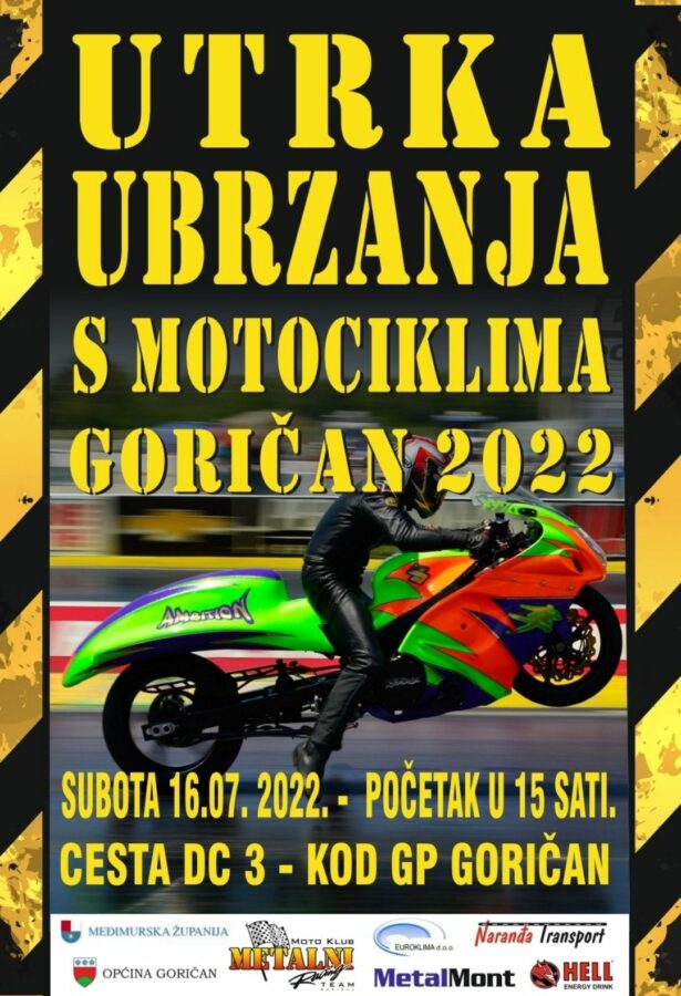 U organizaciji Moto kluba Metalni Racing Team iz Goričana u subotu, 16. srpnja 2022. godine, održat će se Utrka ubrzanja s motociklima Goričan 2022, na cesti DC3 kod Graničnog prijelaza Goričan.