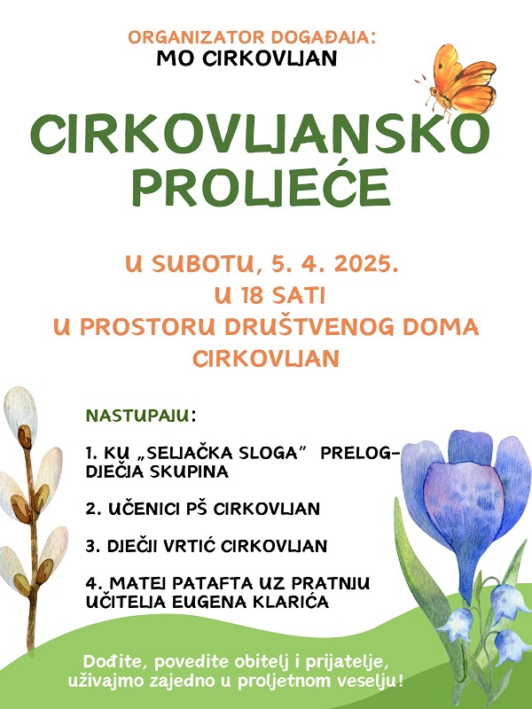 Dani su nam sve duži i topliji, proljeće je stiglo, a ovo je savršena prilika da ga dočekamo uz dječje veselje, pjesme i nastupe. Dođite u subotu, 5. travnja, u Cirkovljan i uživajte u razigranom i srdačnom programu!