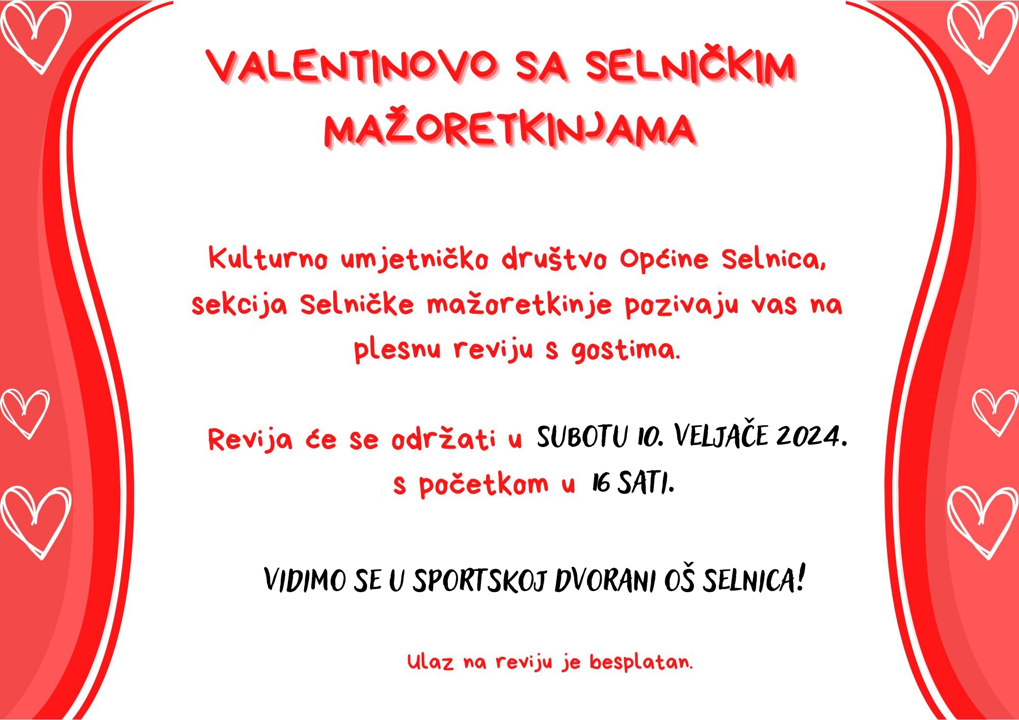 U organizaciji KUD-a Selnica- sekcije Selničkih mažoretkinja i Općine Selnica pozivamo Vas na četvrtu revijalnu smotru mažoretkinja pod nazivom „Valentinovo sa Selničkim mažoretkinjama”.