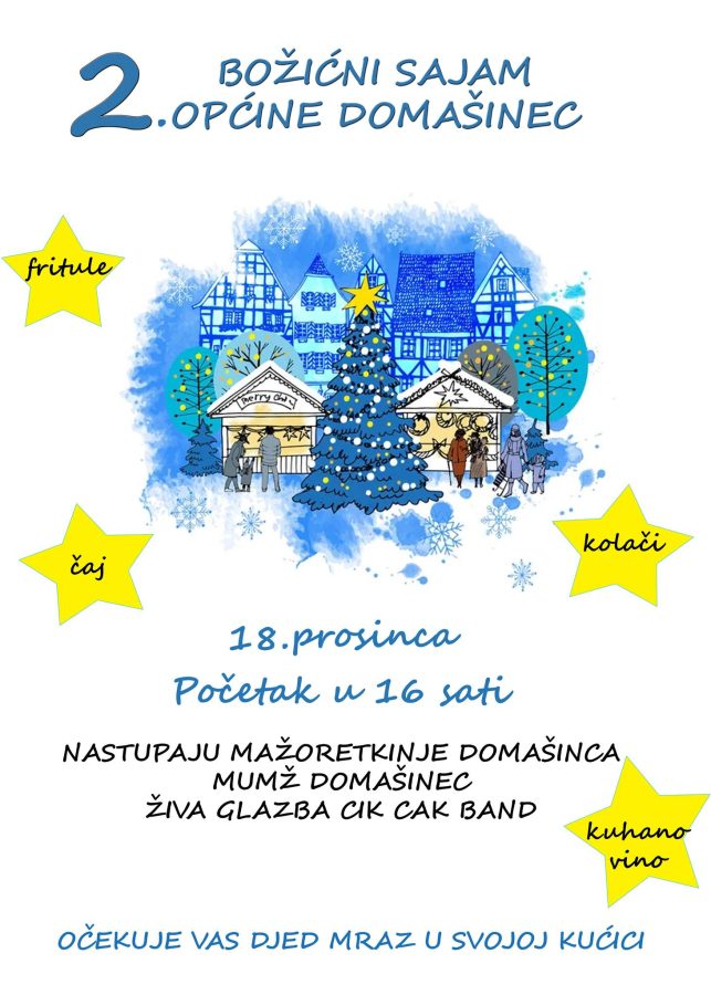 Općina Domašinec s udrugama organizira 2. Božićni sajam u Domašincu, koji će se održati u nedjelju, 18. prosinca 2022. godine u Parku Domašinec (Marka Kovača bb, iza zgrade Općine) s početkom u 16 sati. Prvi Božićni sajam prošle godine, pokrenut na inicijativu vijećnice Općinskog vijeća Općine Domašinec Emine Lacković Ferenc, bio je pun pogodak, a ove godine stiže u još bogatijem izdanju!