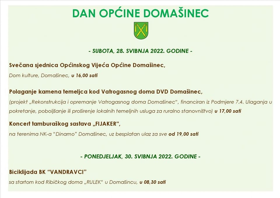 Svečanost će se nastaviti polaganjem kamena temeljca kod Vatrogasnog doma DVD-a Domašinec u 17 sati, kao obilježavanje početka radova u sklopu projekta „Rekonstrukcija i opremanje Vatrogasnog doma Domašinec“, a završiti koncertom tamburaškog sastava Fijaker pod šatorom na terenima NK-a Dinamo u Domašincu u 19 sati. Ulaz je besplatan.