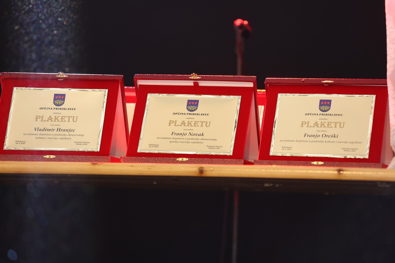 Svečanost je bila u znaku zahvalnosti i priznanja zaslužnim pojedincima i udrugama. Posthumno su nagrađeni Vladimir Hranjec i Franjo Novak za doprinos obrazovanju, kulturi, sportu i razvoju zajednice, a plakete su uručene i Mariji Varga, Rudolfu Lončariću, Franji Oreškom te DVD-u Pribislavec. Zahvalnice su primili Dragutin Balog, Stjepan Jarni i Rahela Varga, dok je pohvalnica dodijeljena Ervinu Šoltiću za doprinos sportu.