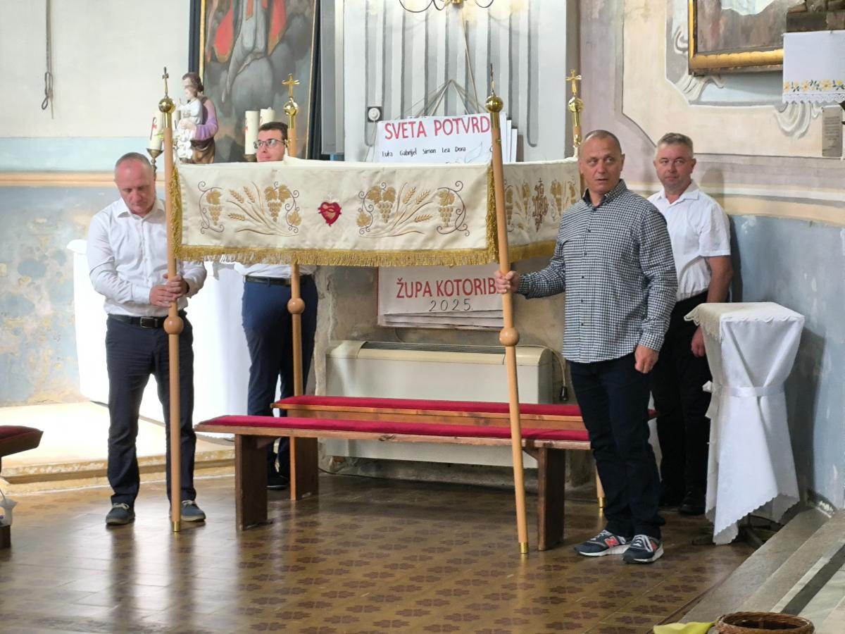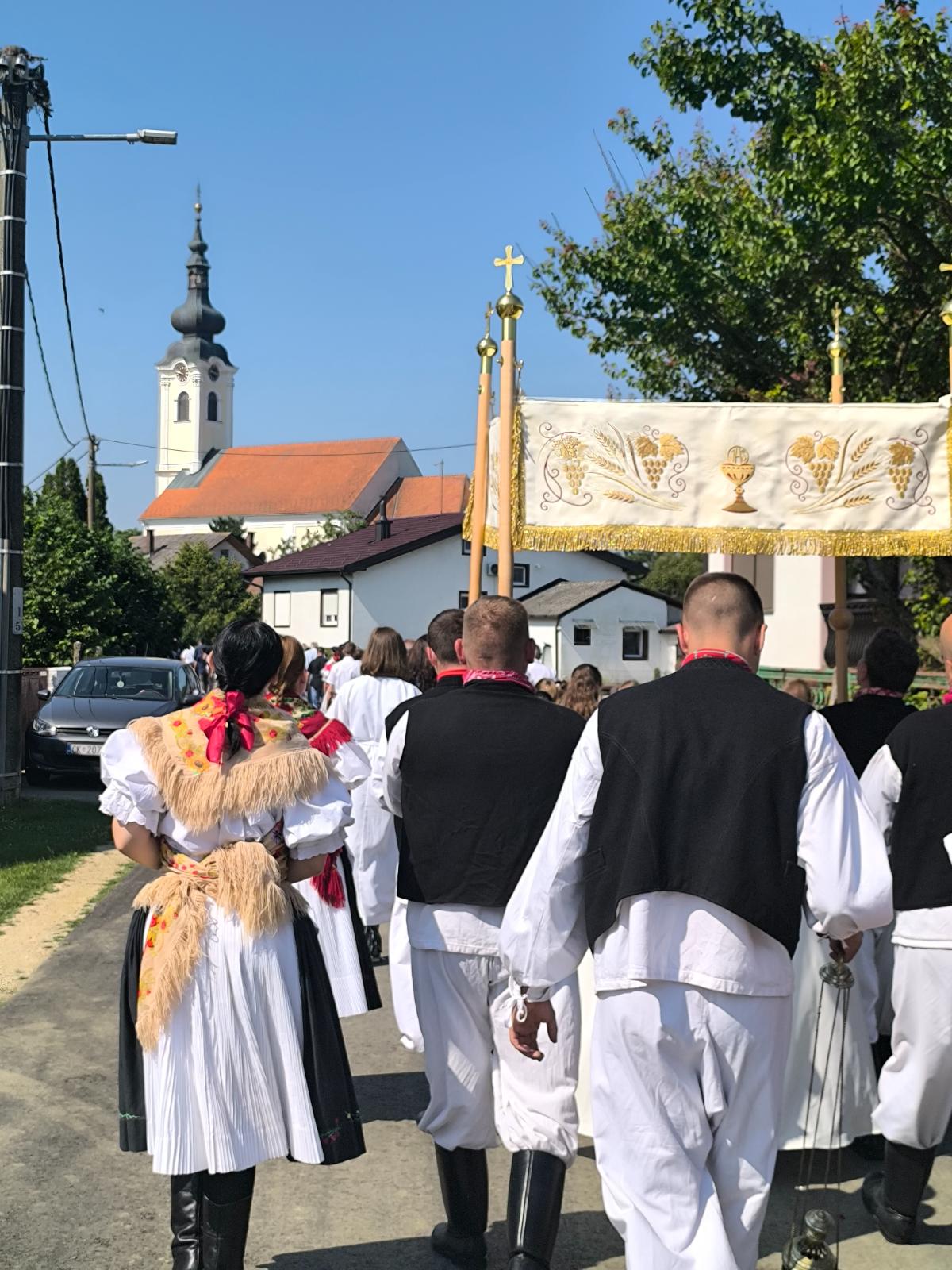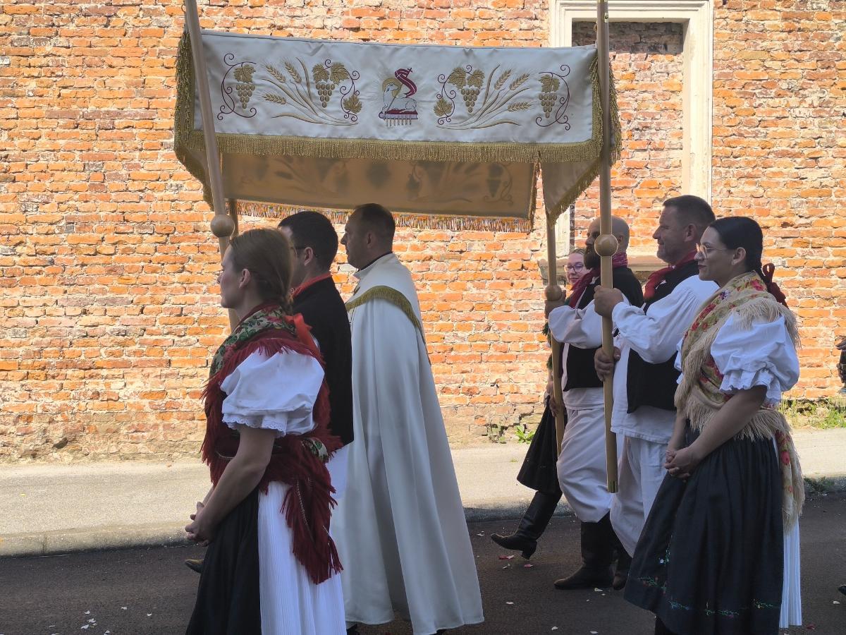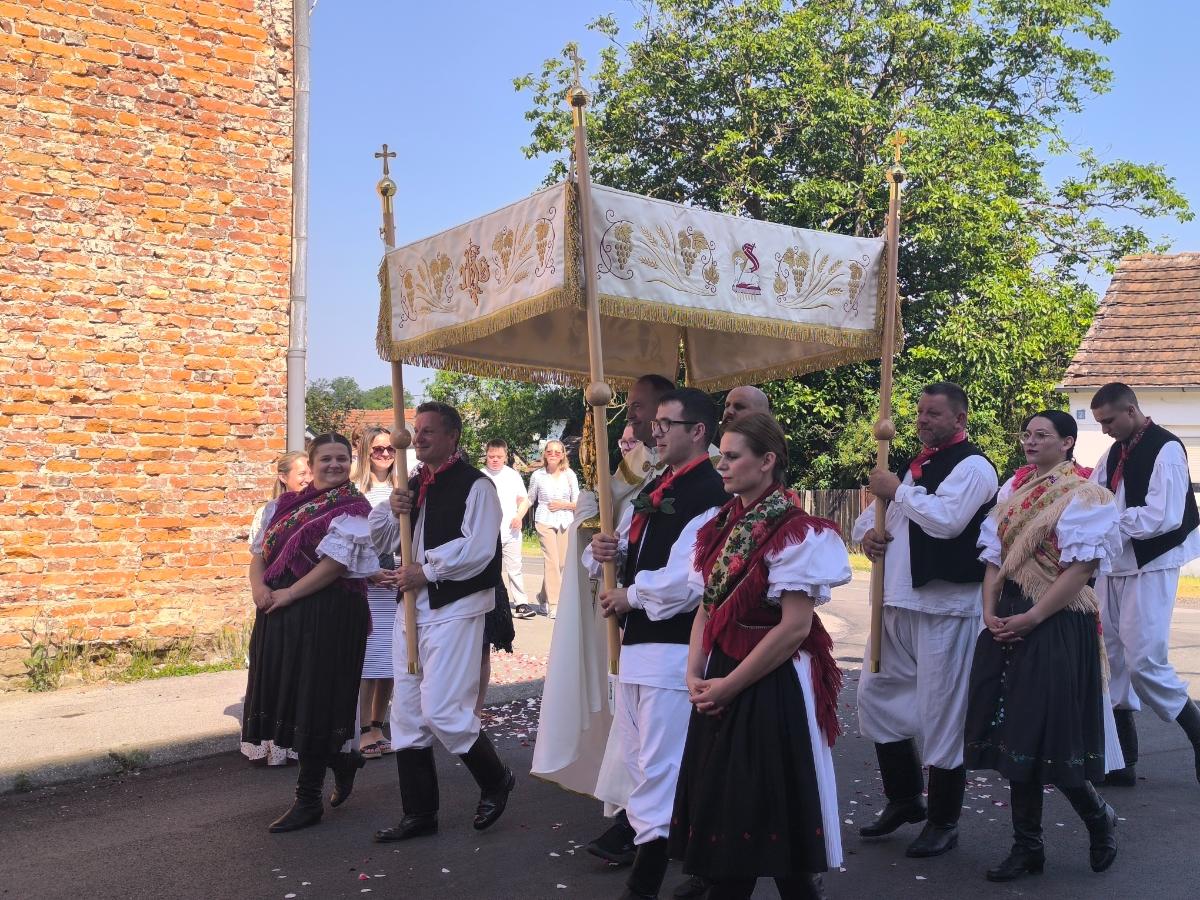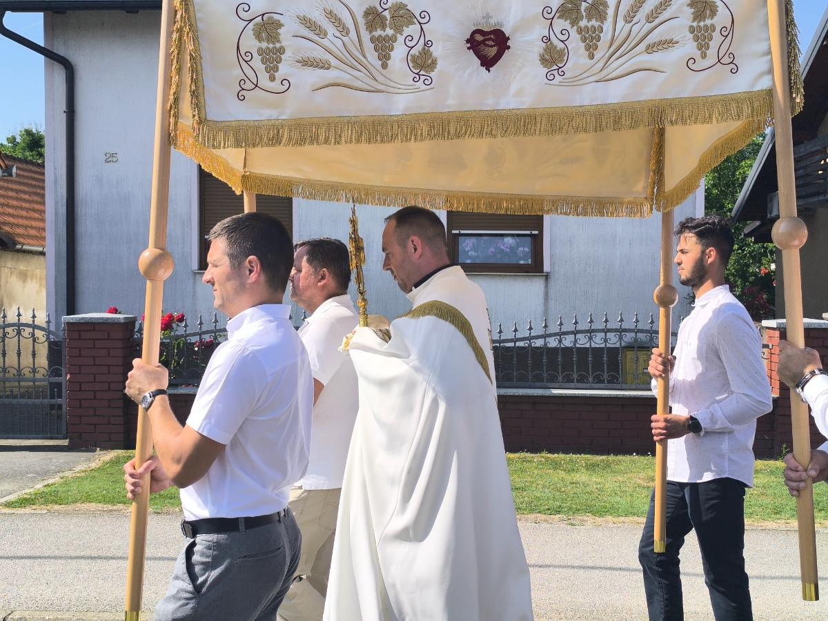 Baldahin “nebo”, koji simbolizira Božju prisutnost i zaštitu, nosili su župljani koji su se izmjenjivali u toj časti. Među njima su bili i vatrogasci i članovi KUDa Kotoriba u narodnim nošnjama. Procesija se kretala selom, prolazila uz pilove, a vjernici su molitvom i pjesmom iskazivali poštovanje prema Presvetom Tijelu i Krvi Kristovoj.