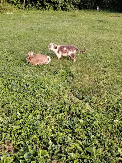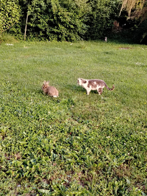 Mačak, znatiželjan i razigran, prvi je stigao u dvorište, a nekoliko mjeseci kasnije pridružio mu se i zeko. Umjesto očekivanog nesporazuma, životinje su se odmah sprijateljile. Danas zajedno istražuju vrt, sunčaju se i dijele hranu, a ponekad čak i drijemaju jedno uz drugo.
