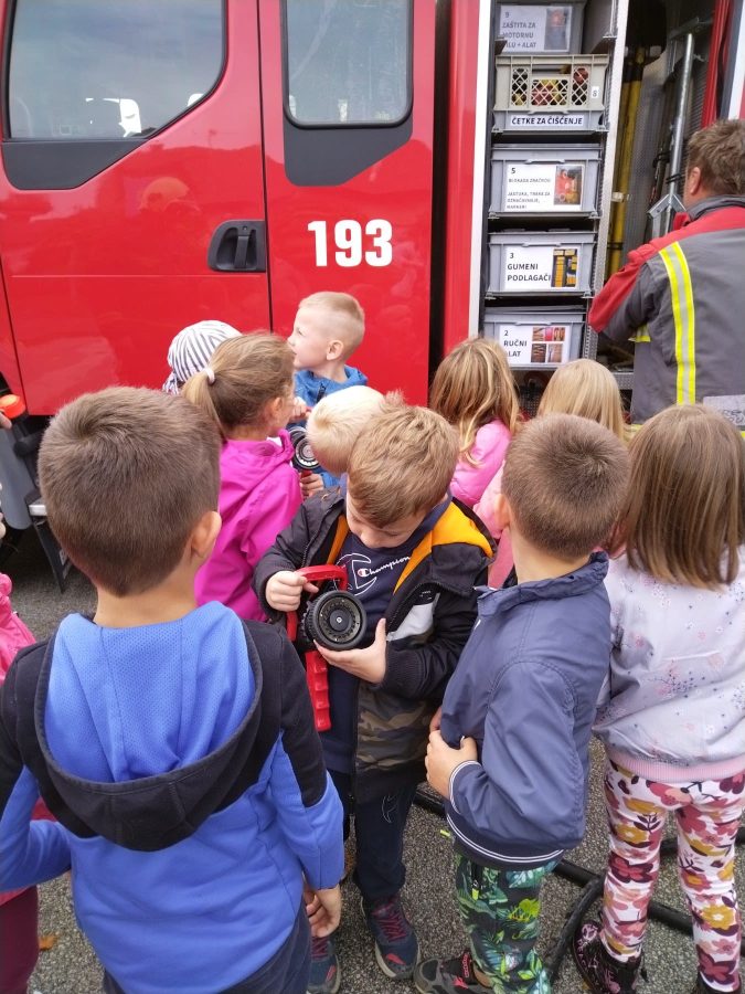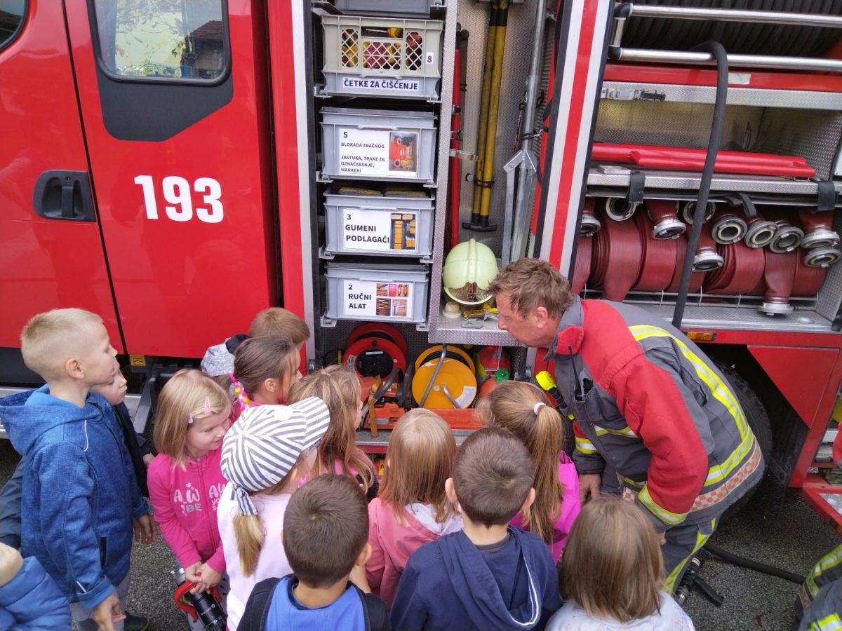 Nakon vježbe djeca su imala prilike razgledati vatrogasno vozilo i opremu koju vatrogaci koriste u svom radu.
