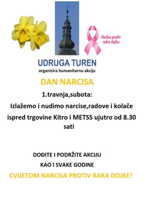 Obilježavanje Dana narcisa, podrške ženama u borbi protiv raka dojke, održat će se u subotu, 1. travnja 2023. godine od 8.30 h ujutro ispred trgovina Kitro i Metss u Podturnu od 8.30 sati, gdje će se moći kupiti narcise, ručni radovi i kolači članica udruge. Dođite i podržite ovu akciju pod geslom „Cvijetom narcisa protiv raka dojke!“