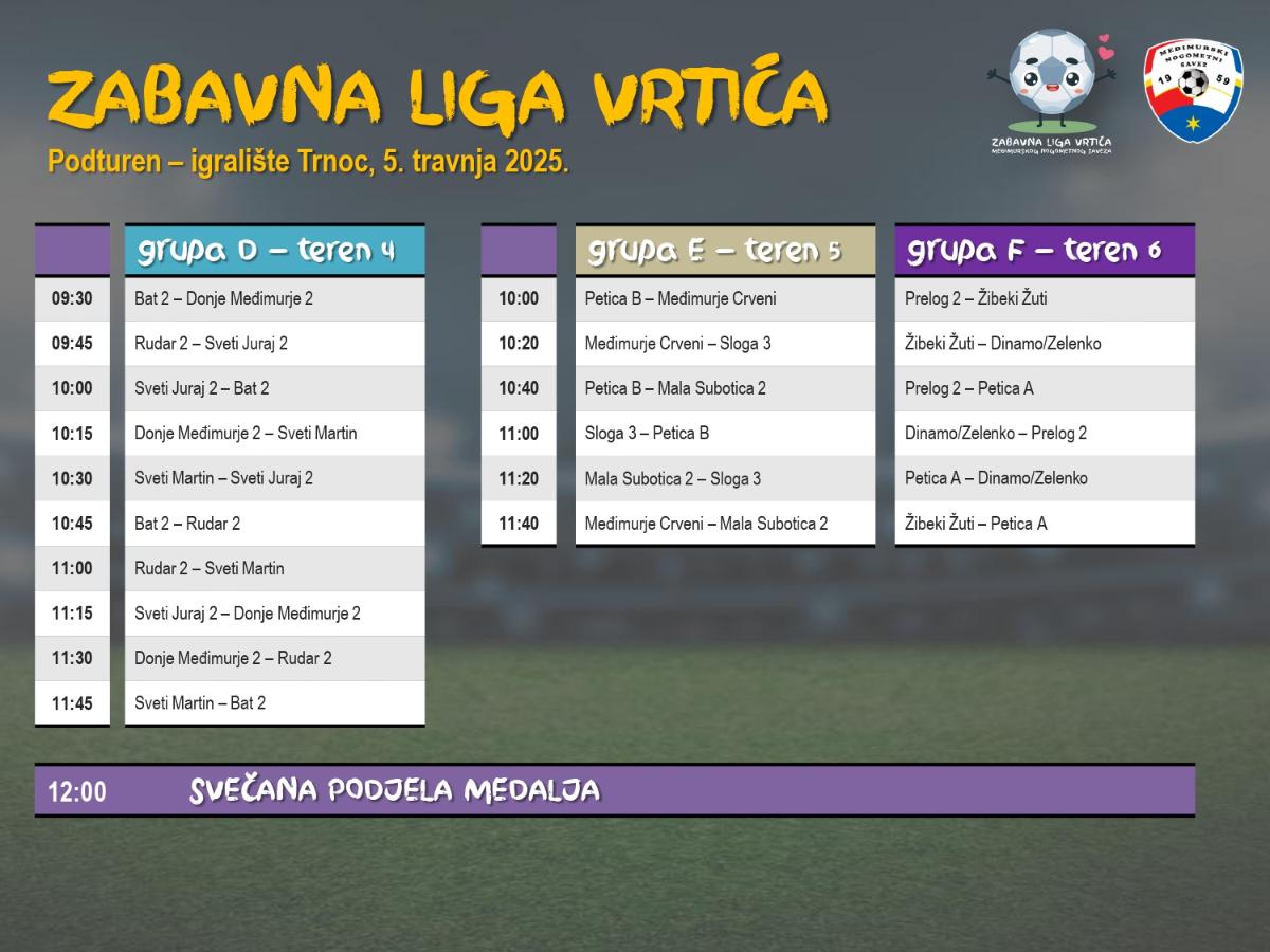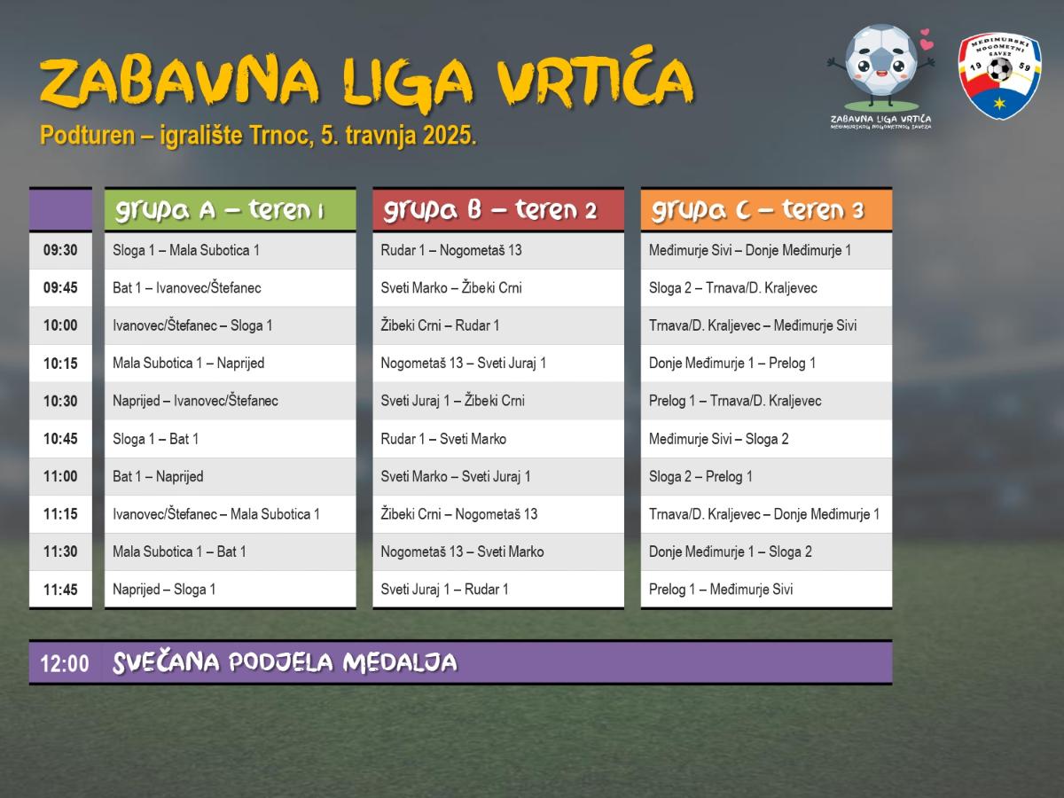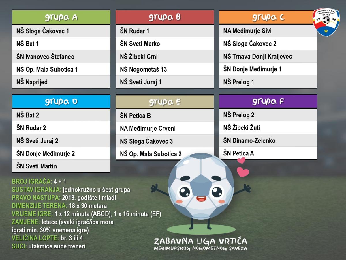 Zabavna liga vrtića namijenjena je nogometnim školama i klubovima koji djeluju na području Međimurske županije, a u svojim redovima okupljaju djecu od 4 do 6 godina starosti. Sutrašnji turnir započinje od 9:30 sati i očekuje se rekordni broj sudionika.  Utakmice se, u sustavu 4+1 i trajanju od 12 i 16minuta, igraju u 6 grupa, na terenima dimenzije 18×30 metara.  Jedini cilj je zabava, jer se rezultati ne pišu i pobjednici su svi, pa će na kraju u 12 sati medalje biti podijeljene svim sudionicima. Dosadašnji turniri su održani u Čakovcu (SRC Mladost, NK Sloga, Stari grad), Cirkovljanu, Gornjem Mihaljevcu, Kotoribi, Maloj Subotici, Prelogu, Savskoj Vesi, Svetom Martinu na Muri, Savskoj Vesi, Zebancu, Pribislavcu, Štefancu i Vučetincu