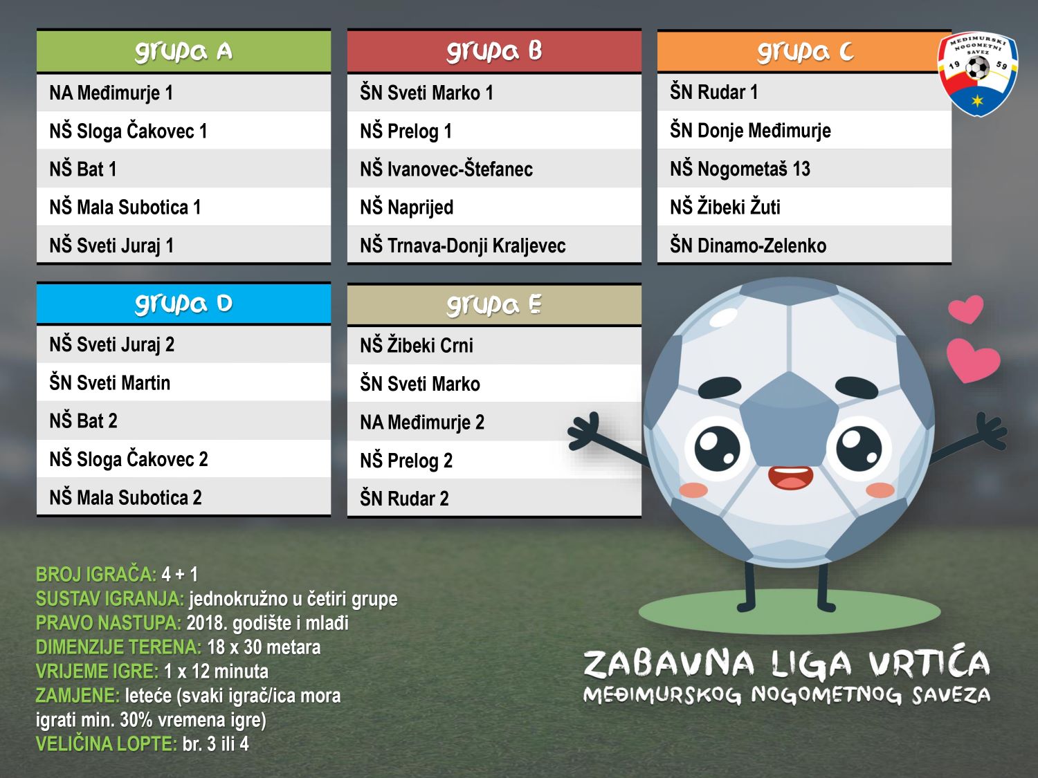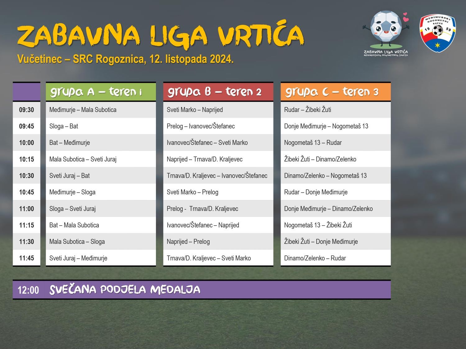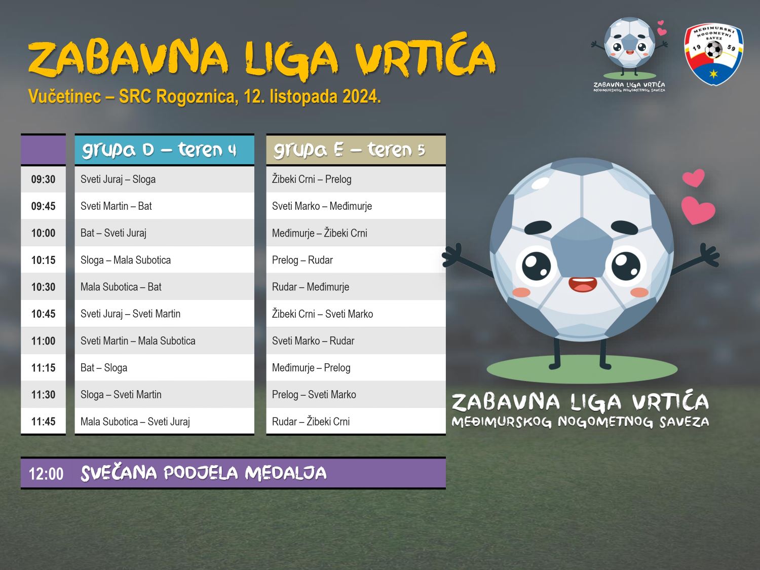 Sljedeći turnir Zabavne lige vrtića održava se sutra, u subotu, 12.listopada od 9:30 sati, na SRC-u Rogoznica u Vučetincu. Utakmice se, u sustavu 4+1 i trajanju od 12 minuta, igraju u 5 grupa, a jedini cilj je zabava, jer se rezultati ne pišu i pobjednici su svi, pa će na kraju u 12 sati medalje biti podijeljene svim sudionicima. Dosada je održano desetak turnira na terenima u Čakovcu (SRC Mladost, NK Sloga, Stari grad), Cirkovljanu, Gornjem Mihaljevcu, Kotoribi, Maloj Subotici, Prelogu, Savskoj Vesi, Svetom Martinu na Muri, Savskoj Vesi, Zebancu, Pribislavcu i Štefancu.