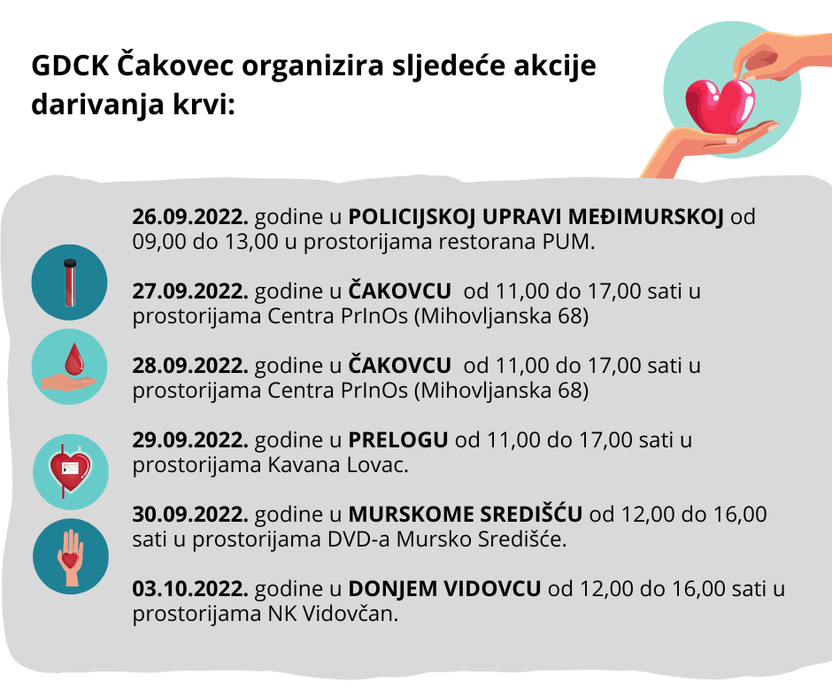 Na dane 27. i 28. rujna akcije će se održati u čakovečkom Centru PrlnOs i bit će od 11 do 17 sati.