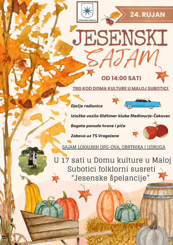 Iz Općine Mala Subotica javljaju da je zbog najave iznimno lošeg vremena za vikend, Jesenski sajam koji se morao održati ove nedjelje (24.9), odgođen za drugu nedjelju 1.10.2023. godine.