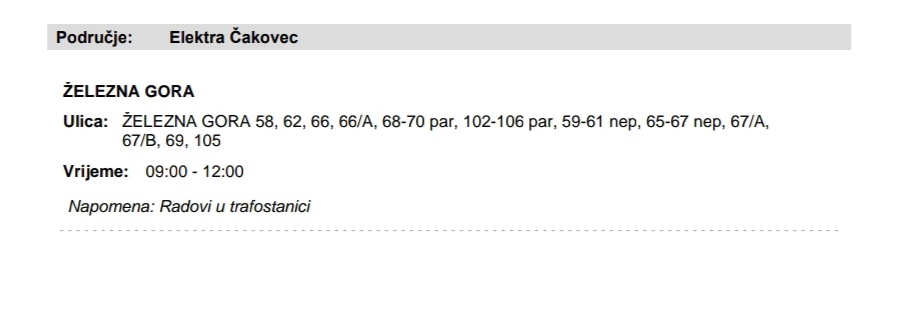 Iz čakovečkog HEP-a stigla je vijest kako zbog radova, u ponedjeljak, 29. srpnja, neće biti struje u Železnoj Gori, a evo i detalja: