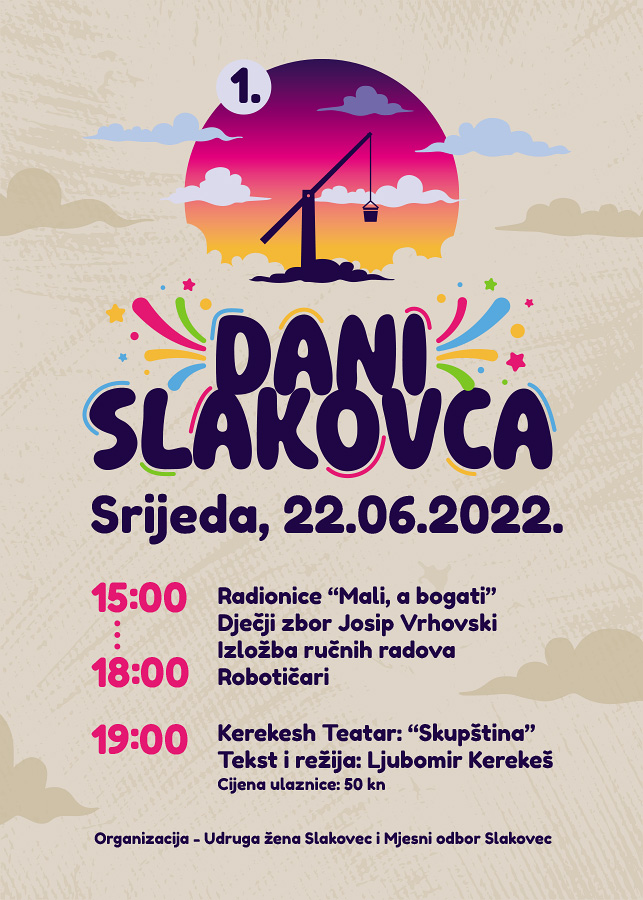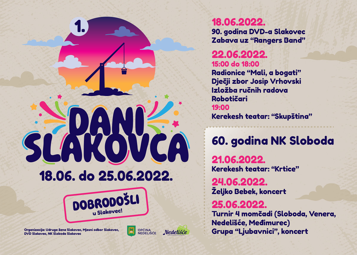 Ove se godine od 18.6. do 25.6.2022. po prvi put u Slakovcu održavaju „Dani Slakovca“. Kroz sedam dana održavanja Udruge i mještani Slakovca pobrinuli su se da bude zaista posebno. Očekuje vas zaista puno događanja, kako bi lakše odabrali donosimo vam program po danima: