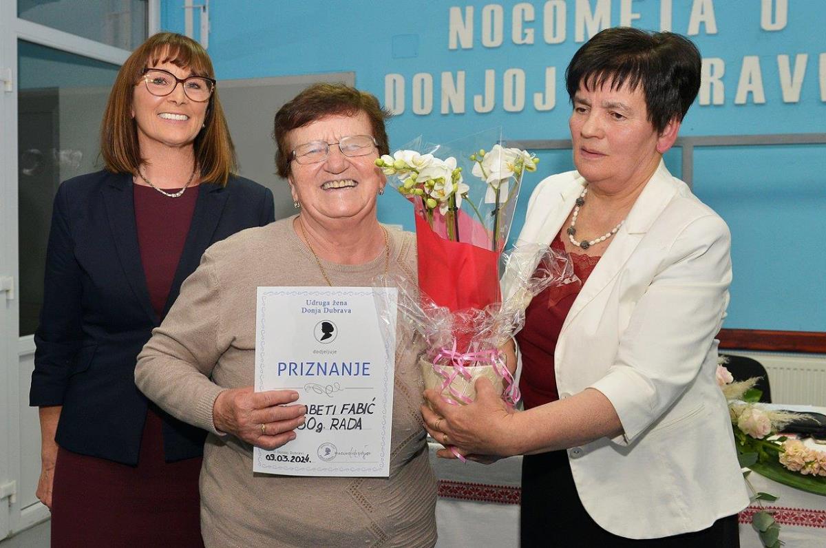 Na skupštini je posebno priznanje primila je Elizabeta Fabić za 50 godina rada u Udruzi žena. Ona je jedna od članica ekipe koja je godinama prezentirala Udrugu i Donju Dubravu na Festivalu gibanice u Mađarskoj.