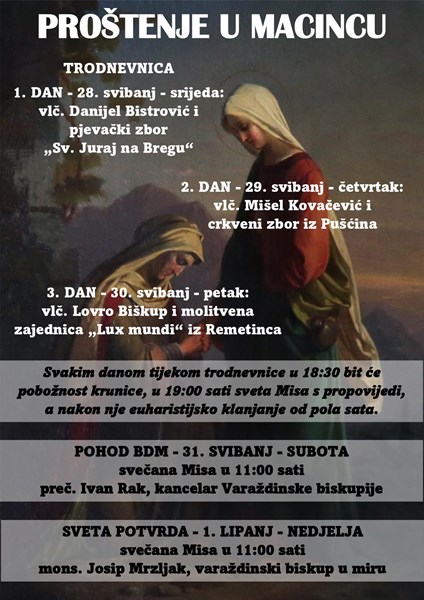 Župa Pohoda Blažene Djevice Marije u Macincu proslavit će svoju župnu svetkovinu u subotu 31. svibnja ove godine.